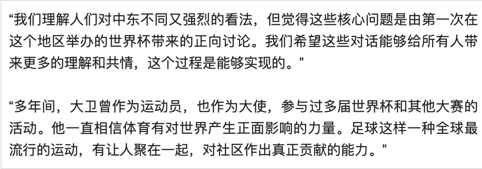 “消极代言”的行为明显不能让卡塔尔的官员们满意,网上对贝克汉姆也是骂声一片。最终面对争议,贝克汉姆的公关团队不得已站出来发声明回应,声明全文如下↓