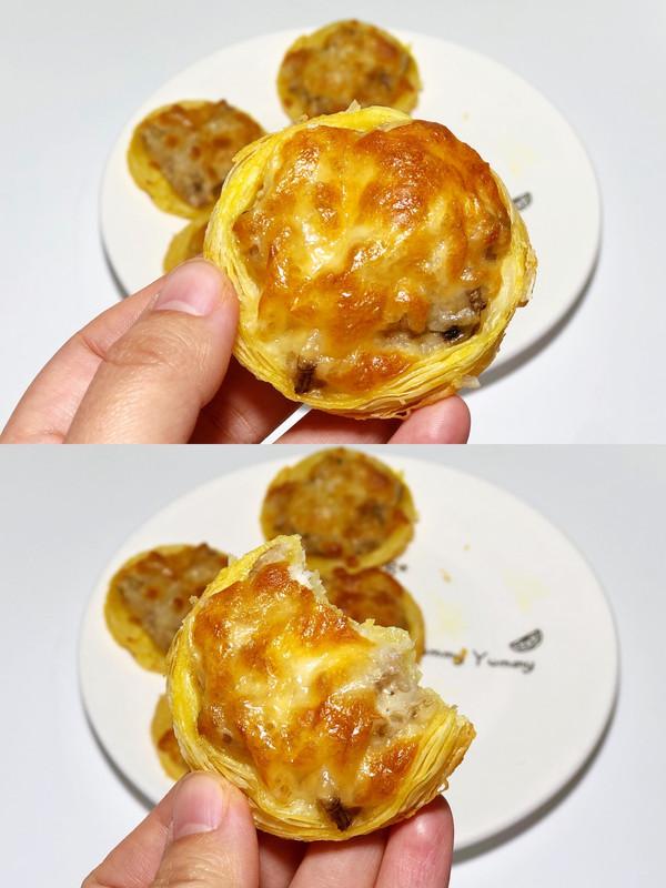 1.准备食材: 碎蛋挞皮、香蕉、马苏里拉奶酪的方法: 宜盾普微蒸烤一体机先预热,然后将香蕉压成香蕉泥。蛋挞皮自然解冻后,取出外层蛋挞支架,压扁,铺上一些香蕉泥,撒上一些马苏里拉奶酪碎,