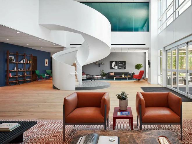 为了更加凸显大堂特色,旁边的休息区设计就较为多元化,设计师遵循着弗兰克·洛伊德·赖特的有机建筑原则,构思了一个与自然环境相关并扎根于自然环境的室内空间,他们将其定义为 “风土设计”。