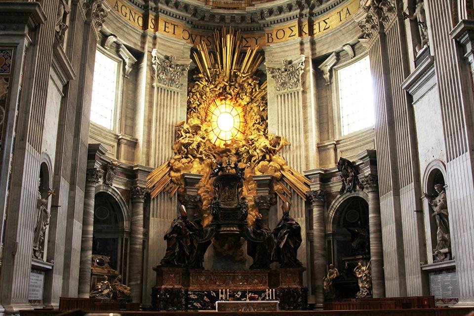 在长达120年的重建过程中,意大利最优秀的建筑师多纳托·布拉曼特(Donato Bramante)、米开朗基罗·博那罗蒂(Michelangelo Buonarroti)、卡洛·马代尔诺Carlo Maderno)、乔凡尼·洛伦佐·贝尼尼(Gian Lorenzo Bernini)等相继主持过设计和施工,直到1626年11 月18日才正式宣告落成。这座闻名于世的大教堂有许多价值连城的艺术品,其中包括米开朗基罗的雕塑作品《圣母怜子》(Pietà)。教堂还设有45座祭坛(altars),包括贝尔尼尼(Bernini)的教皇祭坛(papal altar)和圣彼得的宝座(Throne of St. Peter)。
