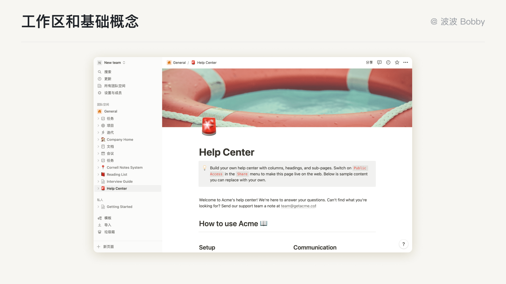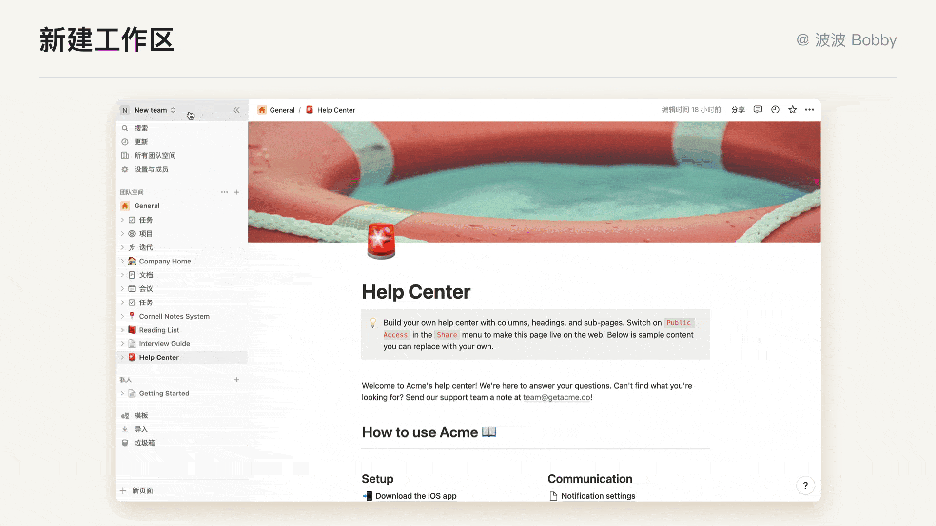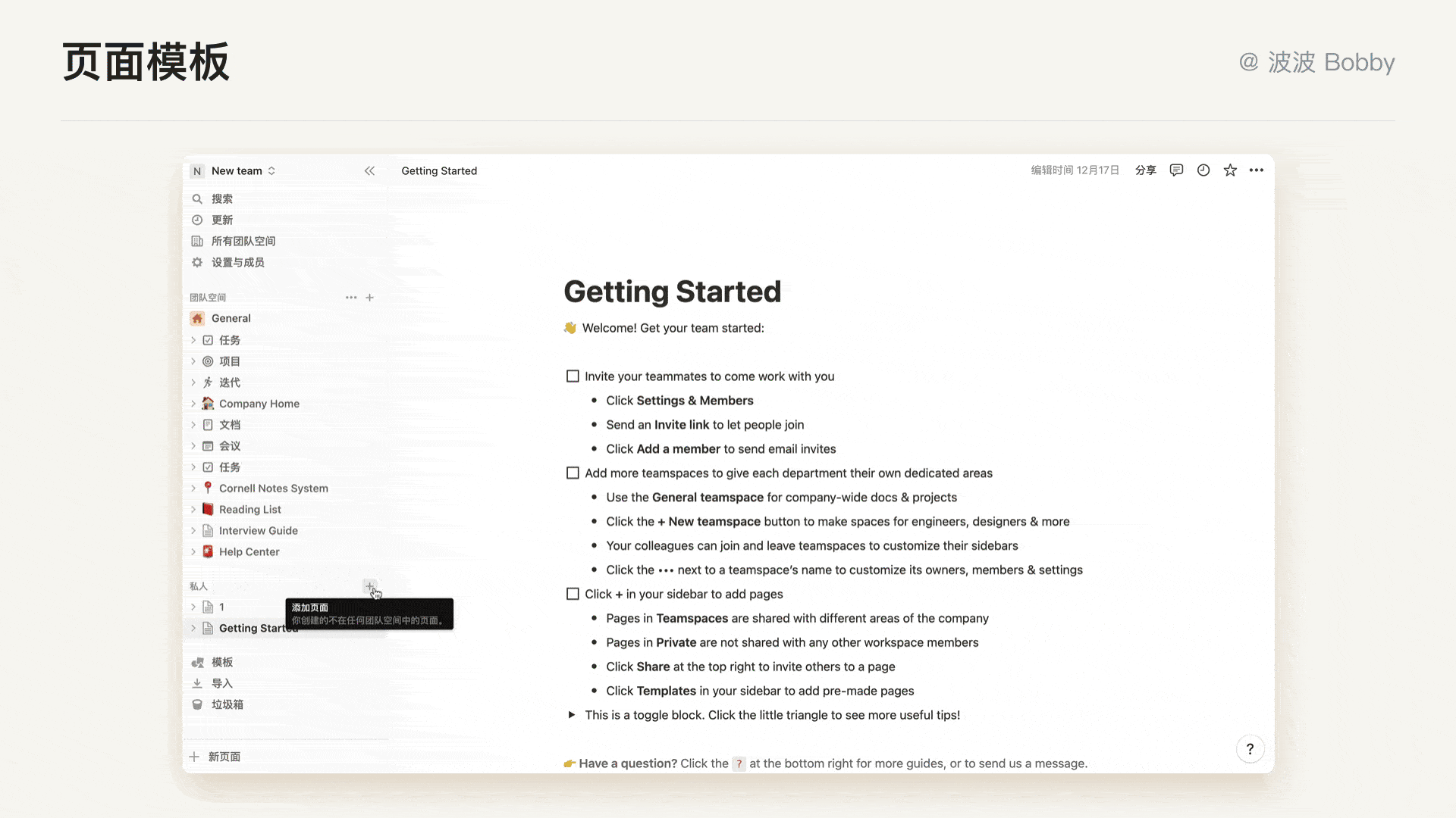 在团队中,侧边栏的Workspace标题下的任何页面都可以被看到,并且很可能被工作区的所有成员编辑(除非另有权限配置)。