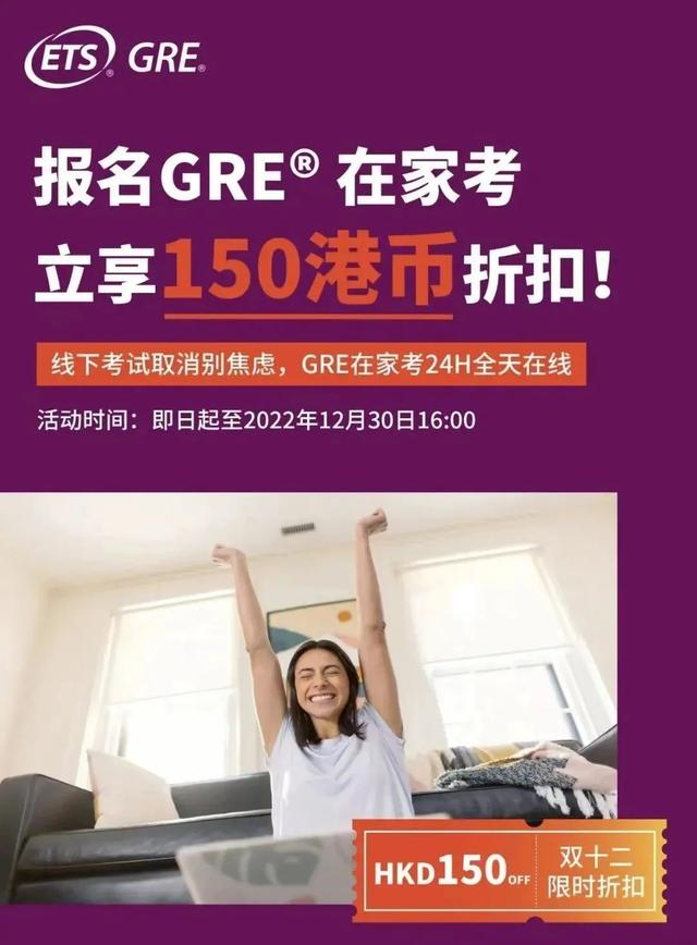 另外,GRE考试价格也有折扣!从现在到2022年12月30日16:00,中国大陆考生通过香港考试评估局(HKEAA)官网订购GRE在家考兑换券,可享受150港元优惠!需要注意的是,考试兑换券号自发出之日起有效期为 12 逾期一个月不退款。