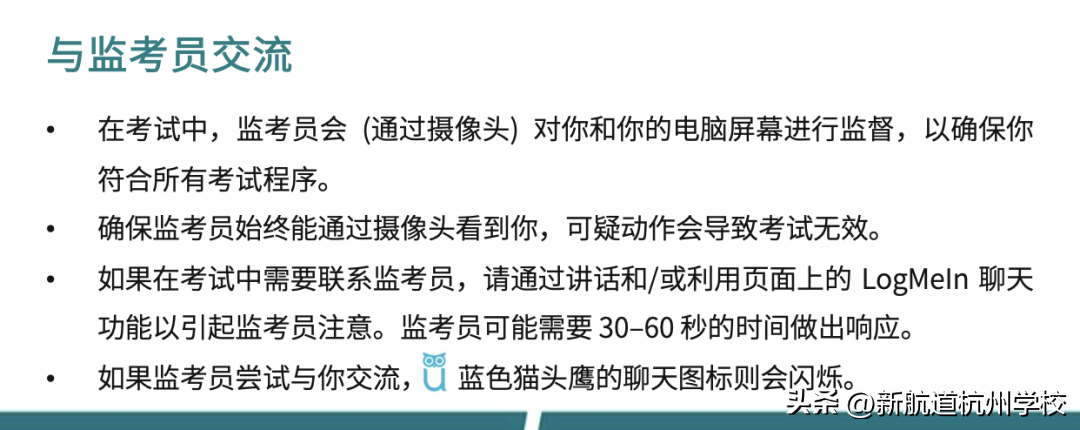 虽然独自在家中考试,但监考员同样会和线下一样,实时为你提供考试流程指引。考试中,一定要随时与监考员保持畅通的交流,当监考员与你交流时蓝色猫头鹰的图标会闪烁,这时需要用心留意哟!