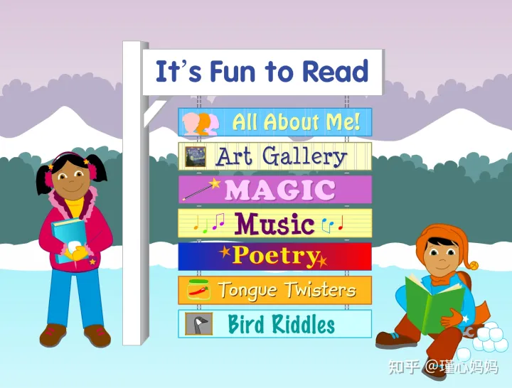 这个模块有很多有趣的阅读,分类不同。包括人物设置、绘画欣赏、魔术师、音乐家、诗歌、绕口令、脑筋急转弯。
