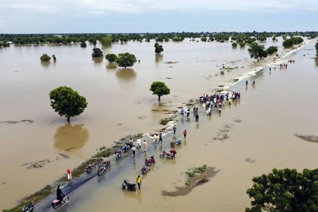 △ 当地时间2022年9月19日,尼日利亚哈德加,人们在暴雨后走过洪水。这是尼日利亚十年来最严重的洪灾。