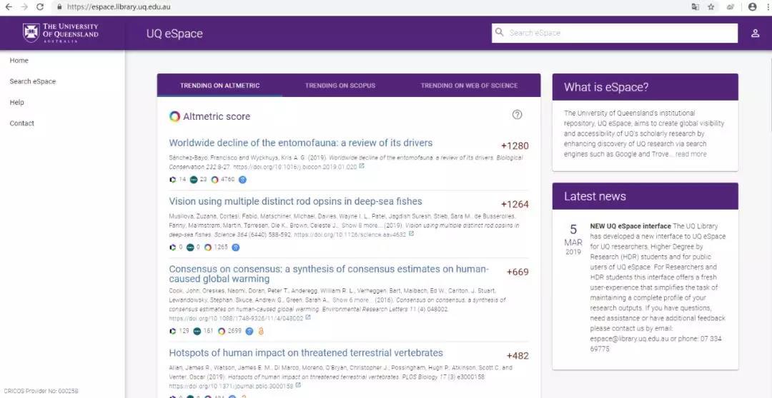 Espace是科廷大学研究机构的资料库,是一个包含科廷大学工作人员和学生研究成果的数字资料库。其中包含数字学位论文、期刊论文、会议论文、书籍章节以及其它科廷大学的研究成果。同时,通过例如Google、Trove、OAlster的开放服务提升其研究成果的影响力。