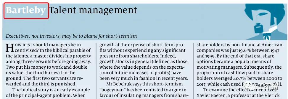 12. Bartleby (巴特尔比,商业版块) — named after the titular character of a Herman Melville short story, this column was established in May 2018. It is written by Philip Coggan.