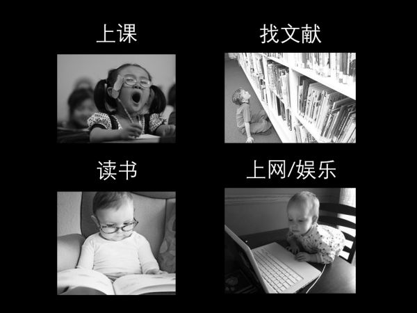 所以我想从我们的同学现在最能感受到复旦大学学习生活的这些环节开始:上课,找文献,读书,上网/娱乐。如果你在这四个环节的学习不到位,或者你的知识管理和阅读有问题,你很可能在最终面对论文题目时无话可说。