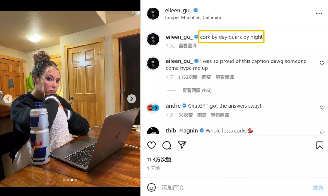 甚至谷爱凌还在ins上专门开玩笑,赶Due人上的生活仿佛是“cork by day quark by night”。
