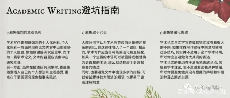 学术写作术写作是一项挑战性的任务,所以很多同学都在问: Academic Writing怎么写?接下来,英国翻译社将向您介绍相关内容Academic Writing写作技巧.全文结构Intro主要围绕学术背景,引入主题; Body具体介绍主要论点, Conclusion重申文章的主题,总结全文.所有信息按逻辑顺序出现,层层递进,避免突兀的转折.段落结构讲述一个论点后,产生了新的想法,另一段可以具体阐述,一段不应该有两个不同的主论点.在每一段开始之前,都要用一个主题句来展示下一个论证的主要方向.确保每一段的主要论点与论文核心的研究问题或研究主题密切相关.句子结构使用各种长度的句子,如简单句子和复杂句子.表强调灵活使用各种连接词,如表因果关系,可使用表转折等.正确使用各种标点符号,避免误用导致读者误解句子意思.04留学生论文写作器论文格式 Cite This For Me帮你轻松处理APA, MLA或哈佛等论文格式.不用担心引文格式错误导致不必要的扣分.除基本参考文献排版功能外,也可以根据文章细分In-text Citation和Reference List.拥有大量词汇的宝藏词典 ThesaurusThesaurus许多教授推荐国际学生使用的宝藏词典,因为它涵盖了大量的词汇,同义词取代了必要的神器.假如你不懂一个单词的解释,单击单词快速显示其具体含义和语法知识.参考文献检索神器 Google Scholar输入相关的Keywords未来,它将弹出大量具有实用价值的文献资源.令人惊讶的是,您也可以直接将参考文献复制到论文中,因为它将附有标准的学术参考格式,非常方便!语法润色神器 Ginger可通过语音输入或文本粘贴输入, Ginger语法错误、拼写错误、标点符号错误等。.它还支持句子重组和词汇翻译的功能,可以帮助你完善论文写作. Ginger它强大的功能有效地帮助你提高英语写作水平.05Academic Writing避坑指南应避免强烈的主观色彩。学术写作应避免强烈的个人色彩。一方面,个人色彩反映在论文内容中,如感谢或研究反思中.作为学术论文,文本内容应集中在研究本身上.另一方面,当你描述研究现象时,你应该避免随意插入你的个人想法和主观感受,关注研究现象和事实陈述.大多数学生认为学术写作应该尽可能多地使用复杂的词汇,但这往往是一种误解.相反的,学术写作应尽可能简化和直接化.如果一个罕见的术语可以被删除或替换为更直接的术语,则选择更容易表达的术语.同时,我们也应该避免文本中多余的措辞。我们可以尝试更换简单的短语,让读者更容易理解句子的意思.学术论文与文学写作或营销文本有很大的不同,如果你在写作过程中故意使用过多的技巧,事实上,它不适用于这种学术环境,所以你应该避免夸大其词.学术论文的重点是清晰地表达论点、信息和学术理论,而不是刺激读者的情绪.因此,你应该避免使用毫无根据的声明和华丽的辞藻来解释主题.06Academic Writing为了让学生更顺利地完成学术写作,自查清单英伦译制社为大家制定了学术写作自查清单。Get!避免非正式语言和稀有缩写,不要直接使用第二人称代词You”.每一段都围绕着一个中心的主要论点展开.避免冗长多余的句子或单词短语.在段落中中使用正确的动词时态,避免情绪化或夸张的词语.文本的每一部分都与开头的主题句密切相关,在论证时,尽可能准确地提供数据支持的信息.参考文献应采用标准格式.并且在引用时,要用适当的过渡句连接我的想法和参考引文.—END—