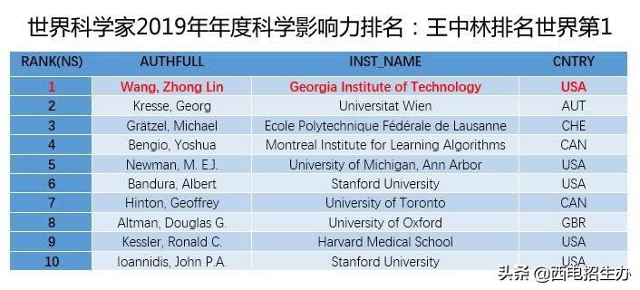 根据世界上最大的学术出版商Elsevier旗下Mendeley Date 根据2020年10月公布的全球10万科学家排名数据,中国科学院北京纳米能源与系统研究所院士王中林,西安电子科技大学1978级校友终身科学影响力(career scientific impact)排名世界第五,2019年科学影响力排名世界第一。王中林教授之前教的佐治亚理工学院也做了重点报道。