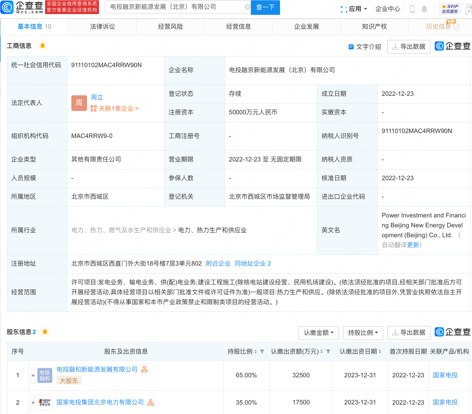 企查查APP据报道,近日,北京电力投资金融新能源发展(北京)有限公司成立,法定代表人为周力,经营范围包括:发电业务、输电业务、热生产供应等。根据国家电力投资集团北京电力有限公司和电力投资金融和新能源发展有限公司共同持有的股权渗透。