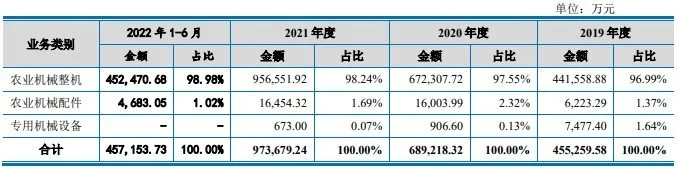 从主营业务收入来看,报告期内,公司农业机械整机收入约占主营业务收入的97%,是公司主营业务收入的主要来源。具体如下: