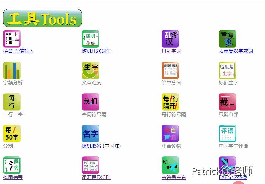 关于林老师的网站,这里多说两句。网站地址是 http://gongpai.sinaapp.com 需要在电脑上打开。网站上的功能异常丰富,由拼音到句型,由游戏到练习纸,由卡片到教室布置一应俱全,网站提供下载的资源并不很多,但只要把字、词、句型输入进去,就可以生成各种各样的资源包。如果说有些网络资源像是财宝箱,那么这个网站更像是聚宝盆。有机会一定写篇文章好好介绍一下这个网站。