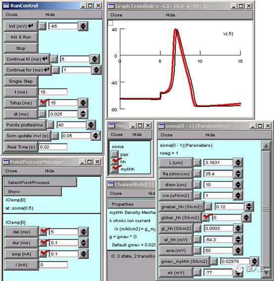 使用在下图中NEURON模拟标准图形用户界面Hodgkin-Huxley 模型的细胞膜动作电位。尽管界面风格有些复古,但研究人员并不在意这些小事。